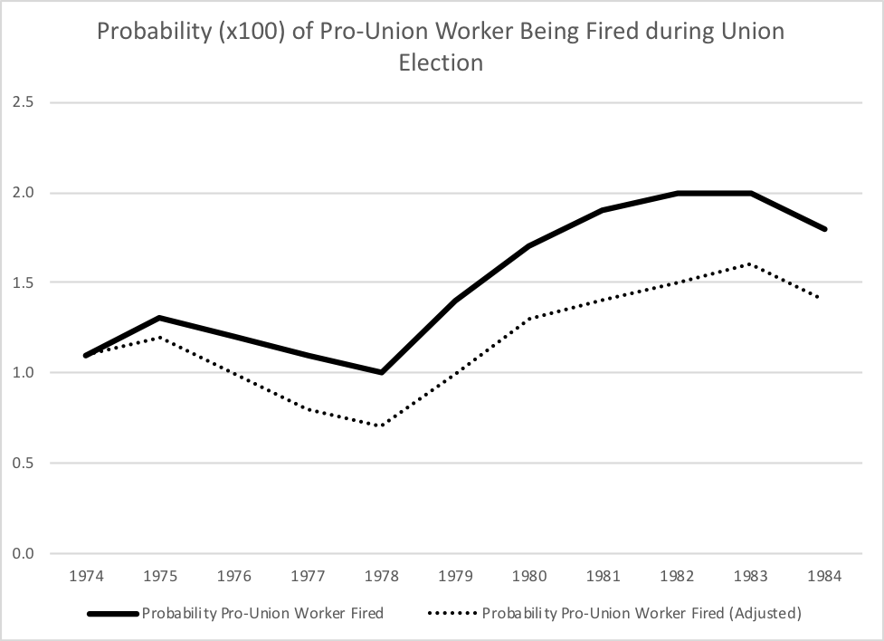 But union elections only impose the “duty to bargain in good faith”; only 60% of union recognition wins turn into first contracts after 2 years. In reality the evidence from these NLRB studies highlights the other little-known fact about labor law: at least since the Supreme Court’s 1930s decisions, and certainly since the 1947 Taft-Hartley bill, the formal NLRB architecture has been more about weakening worker collective action than strengthening it. The number of workers added to unions via NLRB elections is tiny (Figure 2), and most unionized workers are joining already-unionized firms, not unionizing the firms they are already in. Frandsen (2017) shows that there is bunching at close elections, and the asymmetry in the bunching varies depending on whether Republicans or Democrats are in control of the NLRB. When Republicans are in charge, there are a suspiciously high number of close union losses, suggesting employers can fight harder without being sanctioned. And fight they do, as the firing rate of pro-union workers shows in Figure 4. Among labor lawyers, playing by NLRB rules is widely acknowledged to be a losing strategy. The bottom line: The NLRB certification process does not regularly result in an increase in union power, and this is particularly true in close elections.